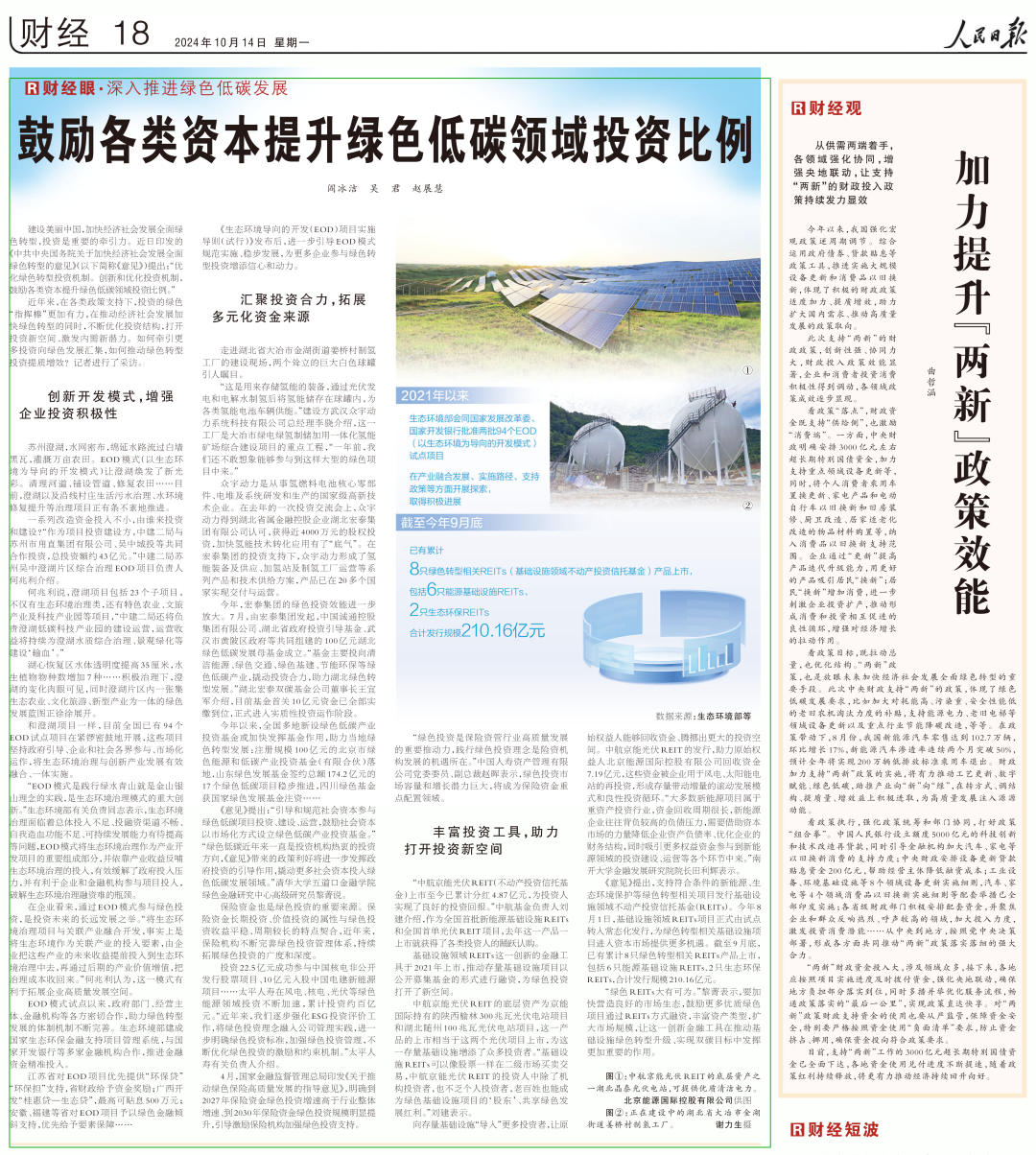 《意見(jiàn)》提出,支持符合條件的新能源、生態(tài)環(huán)境保護(hù)等綠色轉(zhuǎn)型相關(guān)項(xiàng)目發(fā)行基礎(chǔ)設(shè)施領(lǐng)域不動(dòng)產(chǎn)投資信托基金(REITs)。今年8月1日,基礎(chǔ)設(shè)施領(lǐng)域REITs項(xiàng)目正式由試點(diǎn)轉(zhuǎn)入常態(tài)化發(fā)行,為綠色轉(zhuǎn)型相關(guān)基礎(chǔ)設(shè)施項(xiàng)目進(jìn)入資本市場(chǎng)提供更多機(jī)遇。截至9月底,已有累計(jì)8只綠色轉(zhuǎn)型相關(guān)REITs產(chǎn)品上市,包括6只能源基礎(chǔ)設(shè)施REITs、2只生態(tài)環(huán)保REITs,合計(jì)發(fā)行規(guī)模210.16億元。
